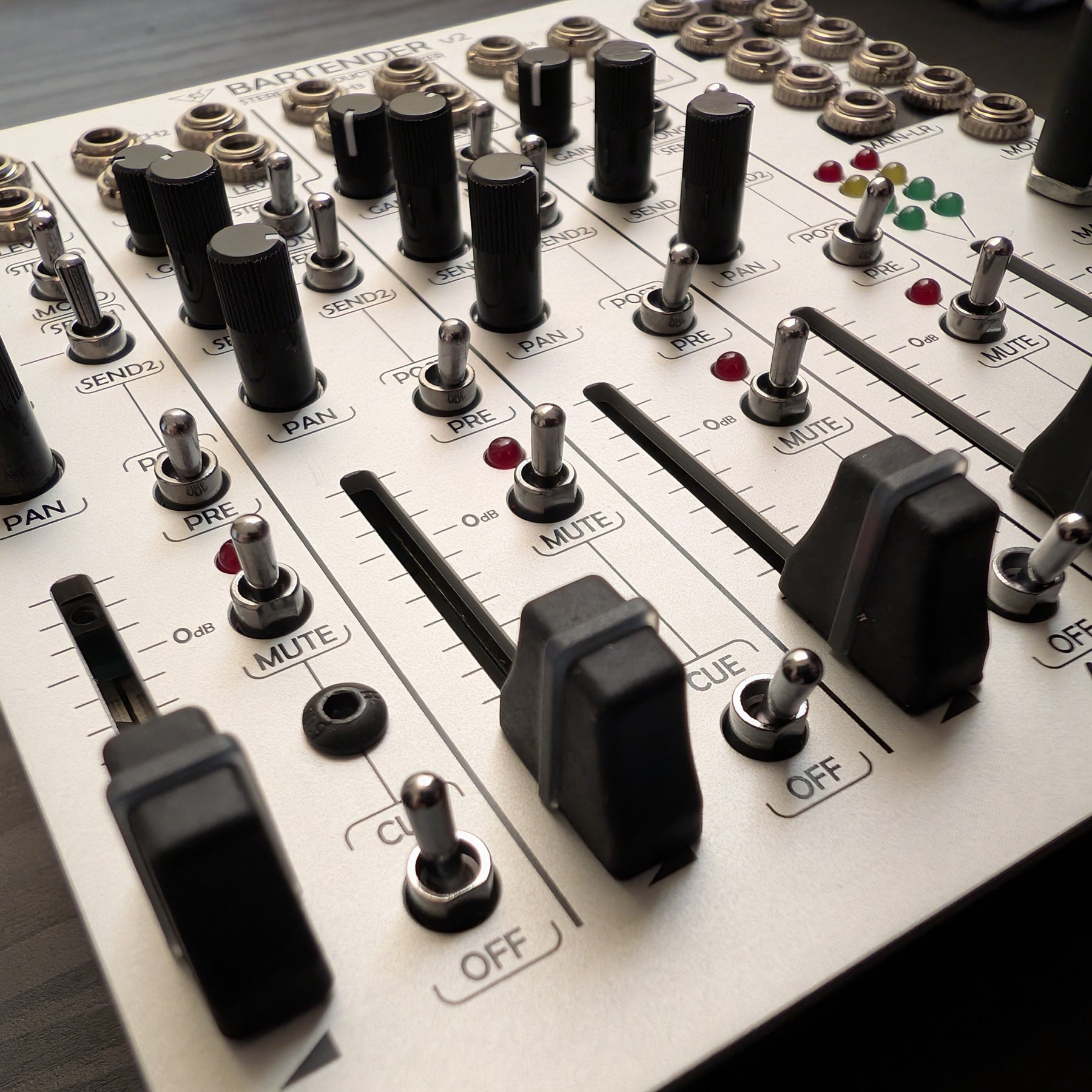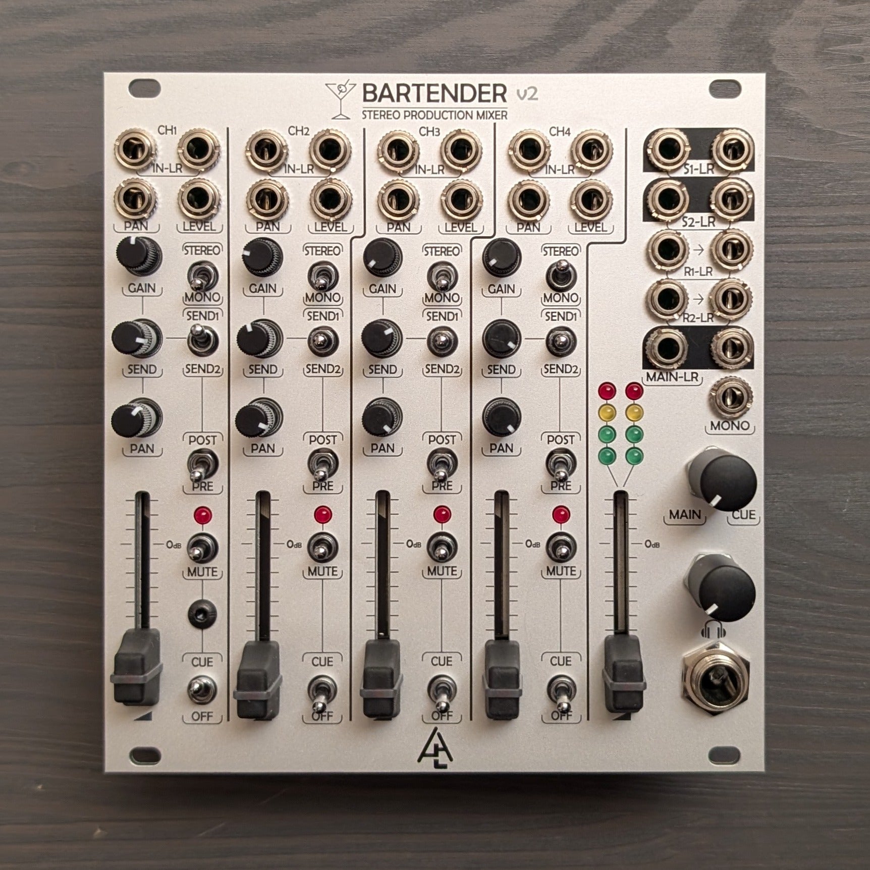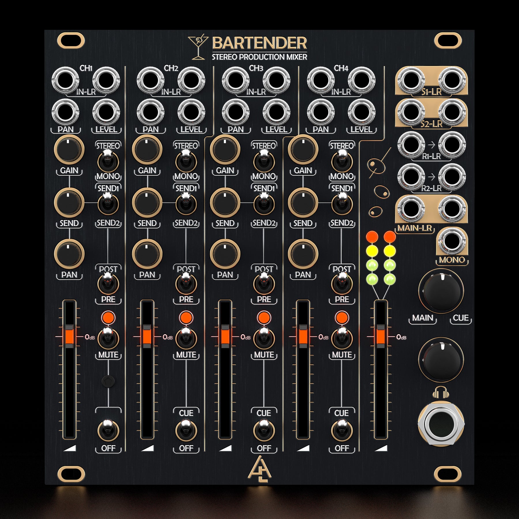 Bartender is the centerpiece of the mixer system. Four stereo channels, with two stereo aux send and two stereo returns. Each channel can be used in a mono mode where both channels are mixed. If you want to do eight channels of mono, you can put the channels in stereo mode (I know it feels backwards) and then use the pan control to control the crossfade between each channel, and then take the mono output. There is a built in cueing system so you can monitor channels in your headphones and control the blend with the main output. You can expand a Bartender with both a Barback and/or another Bartender. When connecting two Bartenders, the main level control on the 'expander' Bartender acts as a group control.